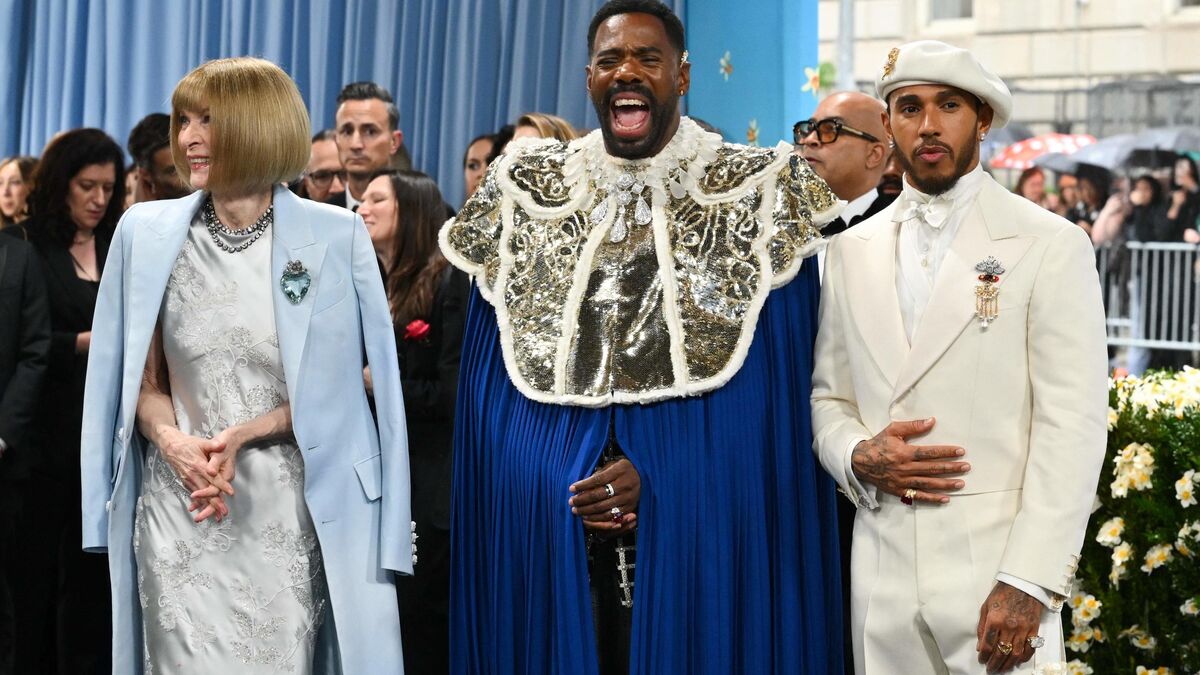 La grande prêtresse de la mode et rédactrice en cheffe de Vogue, Anna Wintour, ici à gauche, a elle aussi répondu présente. L’acteur Colman Domingo, désigné coprésident de l’édition 2025, ici au centre, a revêtu une cape bleu roi en hommage à feu André Leon Talley, le premier directeur créatif afro-américain chez Vogue. L’autre coprésident du gala, le pilote de Formule 1 Lewis Hamilton, ici à droite, a défilé en costume crème impeccable assorti à son béret et diamants éclatants.
