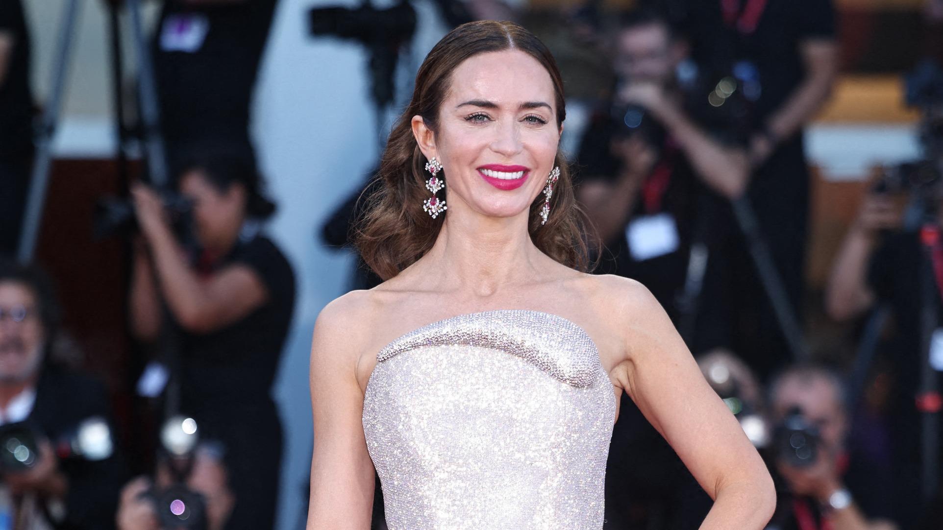 L’autre temps fort de la soirée, c’était la présentation de The Smashing Machine, réalisé par Benny Safdie. Dwayne Johnson y campe Mark Kerr, légende du MMA des années 90, auprès d’Emily Blunt, qui incarne son épouse, Dawn Staples. Le duo d’acteurs a offert un défilé mode aux photographes dès son arrivée au Grand Hôtel Excelsior au Lido : la figure phare du Diable s’habille en Prada rayonnait dans une robe Schiaparelli couleur bleu layette avec des bretelles bijoux et des pièces de joaillerie signées Ysso. Puis c’est lovée dans une robe rose pâle scintillante Tamara Ralph avec des chaussures custom Rene Caovilla, des boucles d’oreilles en platine et or 18k, spinelles et diamants, et deux bagues Tiffany & Co, qu’elle est réapparue le soir au bras de son partenaire de jeu, en costume croisé gris Prada.